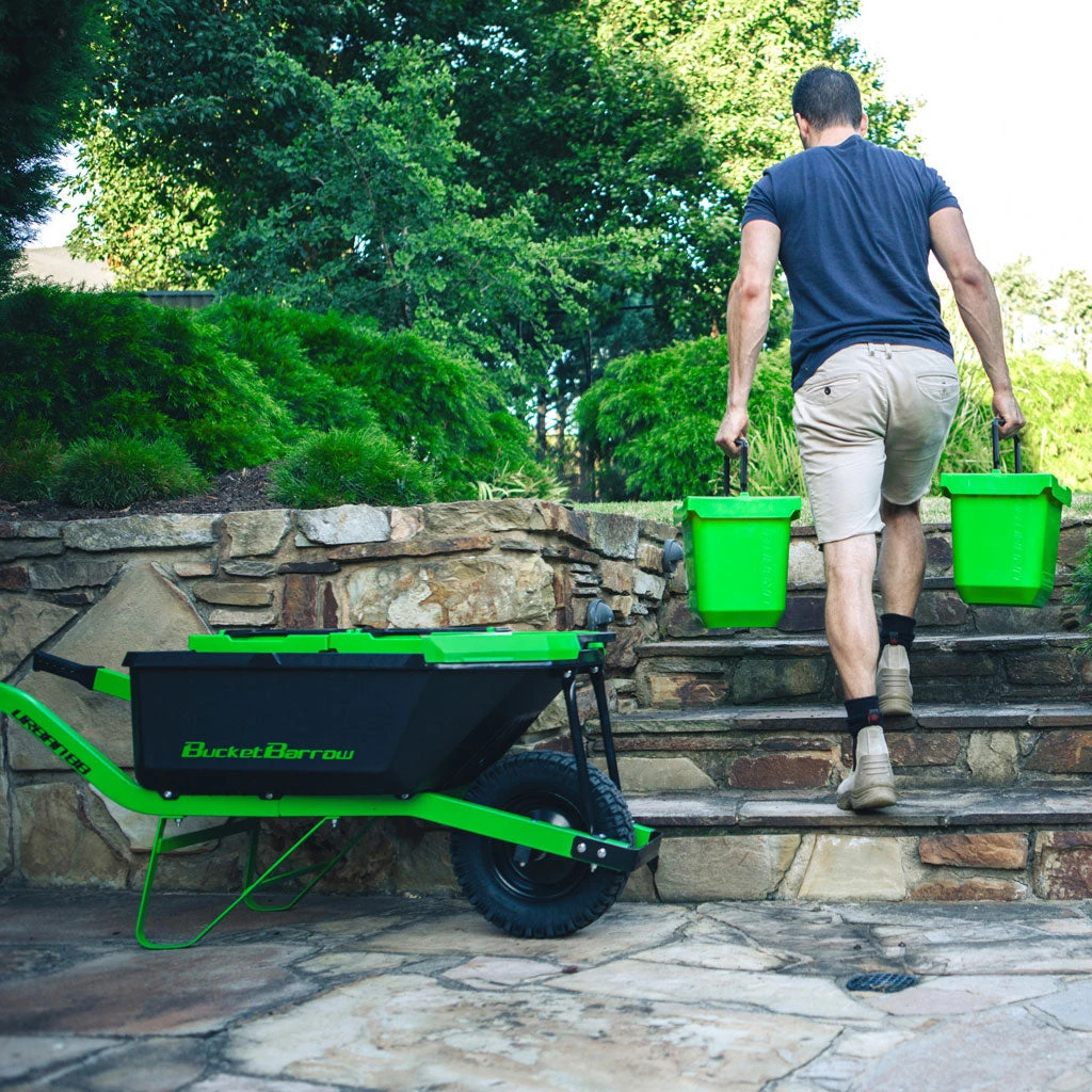 Complete with four super strong 15 litres buckets – made from premium 2.5mm polypropylene strengthened with extra ribbing and with a sturdy comfort moulded plastic handle. These buckets have both internal and external litre markings. Two will fit snuggly into the width of the barrow. Four fill the main space of the barrow and allow you to divide contents into smaller, more manageable containers which can be lifted out and emptied or filled as required.