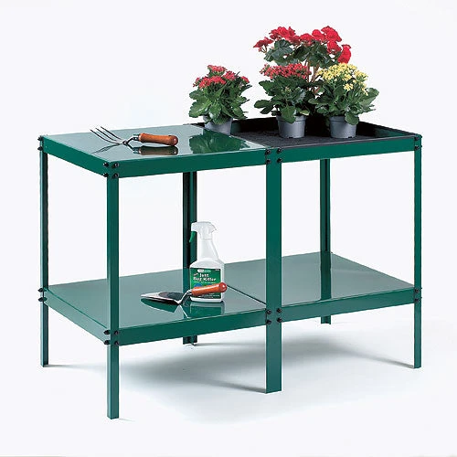 Each section consists of two reversible trays 23 inches (58.5cm) x 20 inches (51cm). These are double bolted to the 30 inches (76cm) high legs to form either a flat surface or 2inches (5cm) deep trays, with the lower tray 8 inches (20cm) from the ground. The lower tier trays not only double the storage/growing area they also give added strength to the structure.