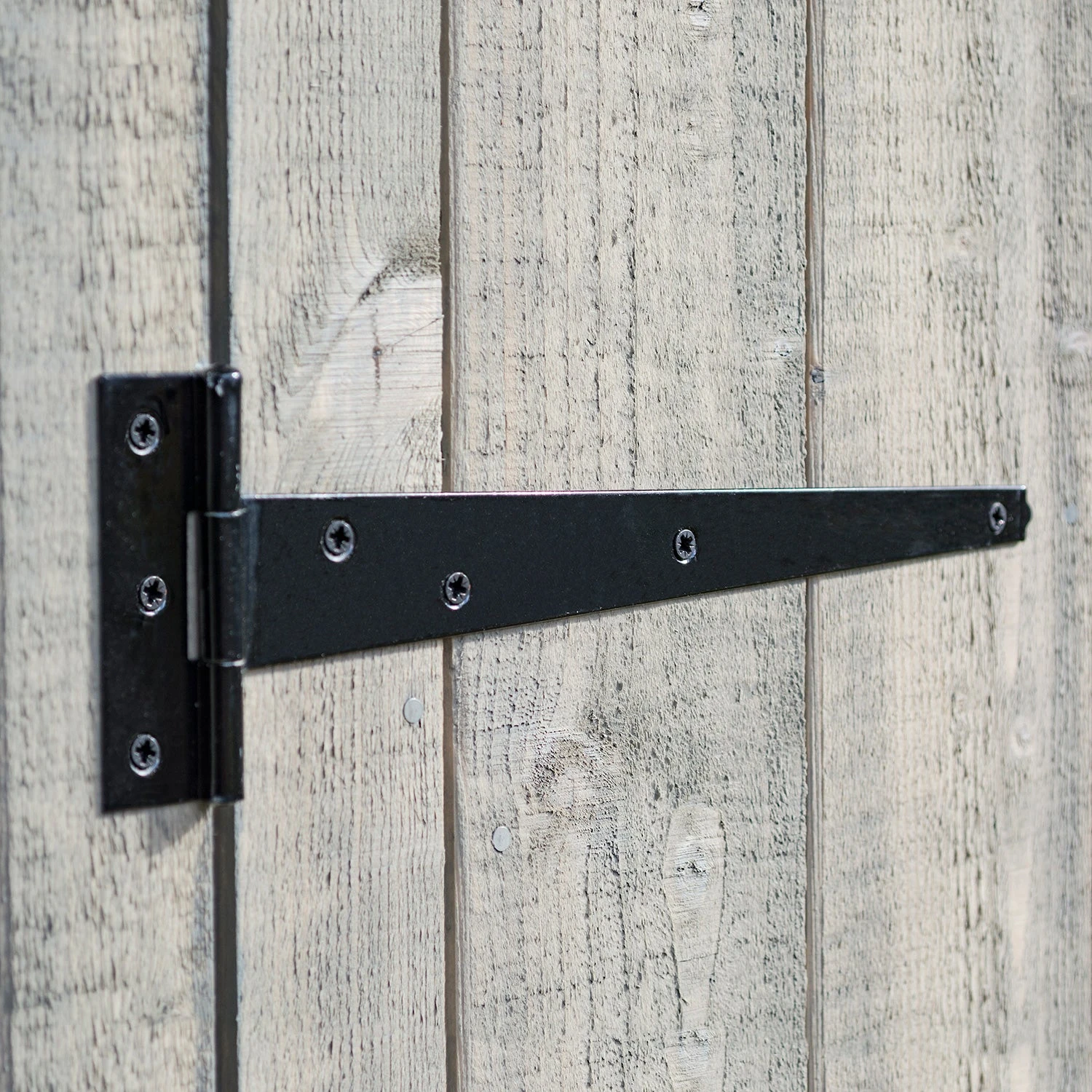 Single Hinged Door – with Z framing for strength and stability. Three large, T-hinges secure the door to the frame of the shed. A pad bolt on the front secures the doors closed – we recommend adding a padlock (not included) for added security. Door opening size : 5ft / 152.5cm high x 2ft 3½in / 69.5cm wide.