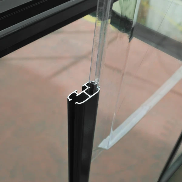 Crystal-clear Single Wall Polycarbonate Wall Glazing – 0.7mm thick this provides over 90% light transmission. It is UV protected so will not discolour, fracture or shatter over time. It is held securely in place in the aluminium frame due to a sliding assembly system, so the complete edge of the glazing is encased by the frame rather than being held in place with clips.