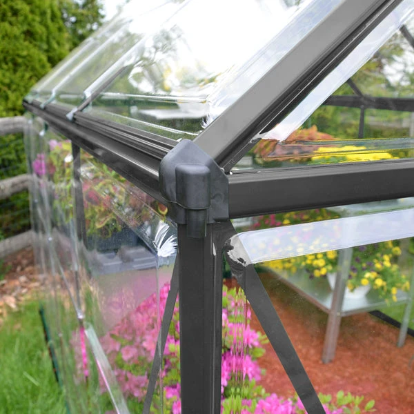 Galvanised Steel Base With Matching Grey Finish – this factory-made, rust-resistant, base will add structural stability to the greenhouse. This base can be anchored to a solid surface (such as concrete) using the pre-drilled holes in the base or it can be fitted to bare earth (fixings not included).
