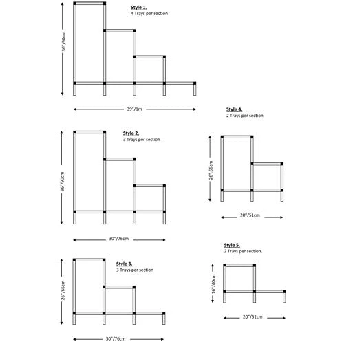 Styles – available in five different styles designed to give a one sided stepped display. These provide you with different heights, spacings and numbers of trays so you can create the best display for the space you have available.